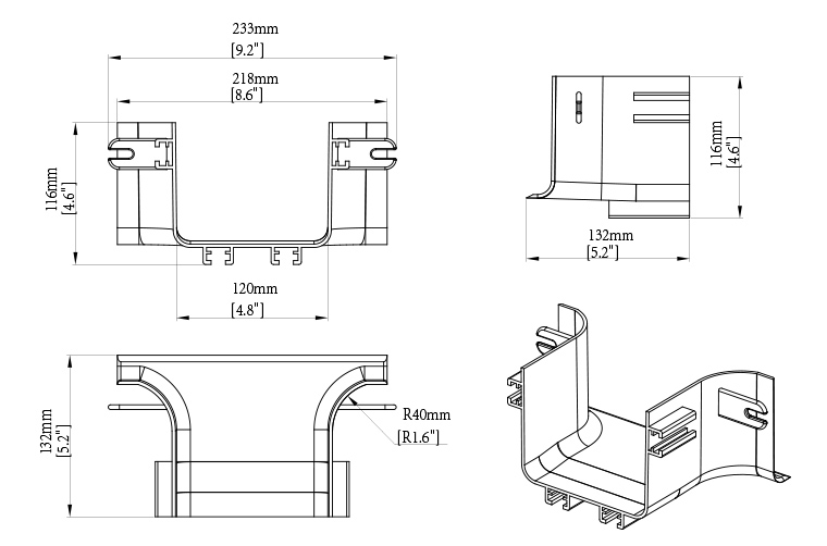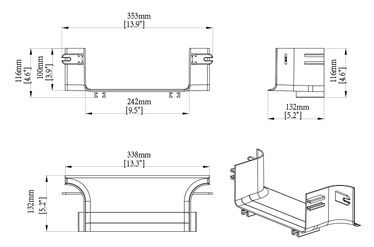 Attaches to 4"x5" channel to creat a 90° horizontal elbow from anywhere of a straight horizontal run.